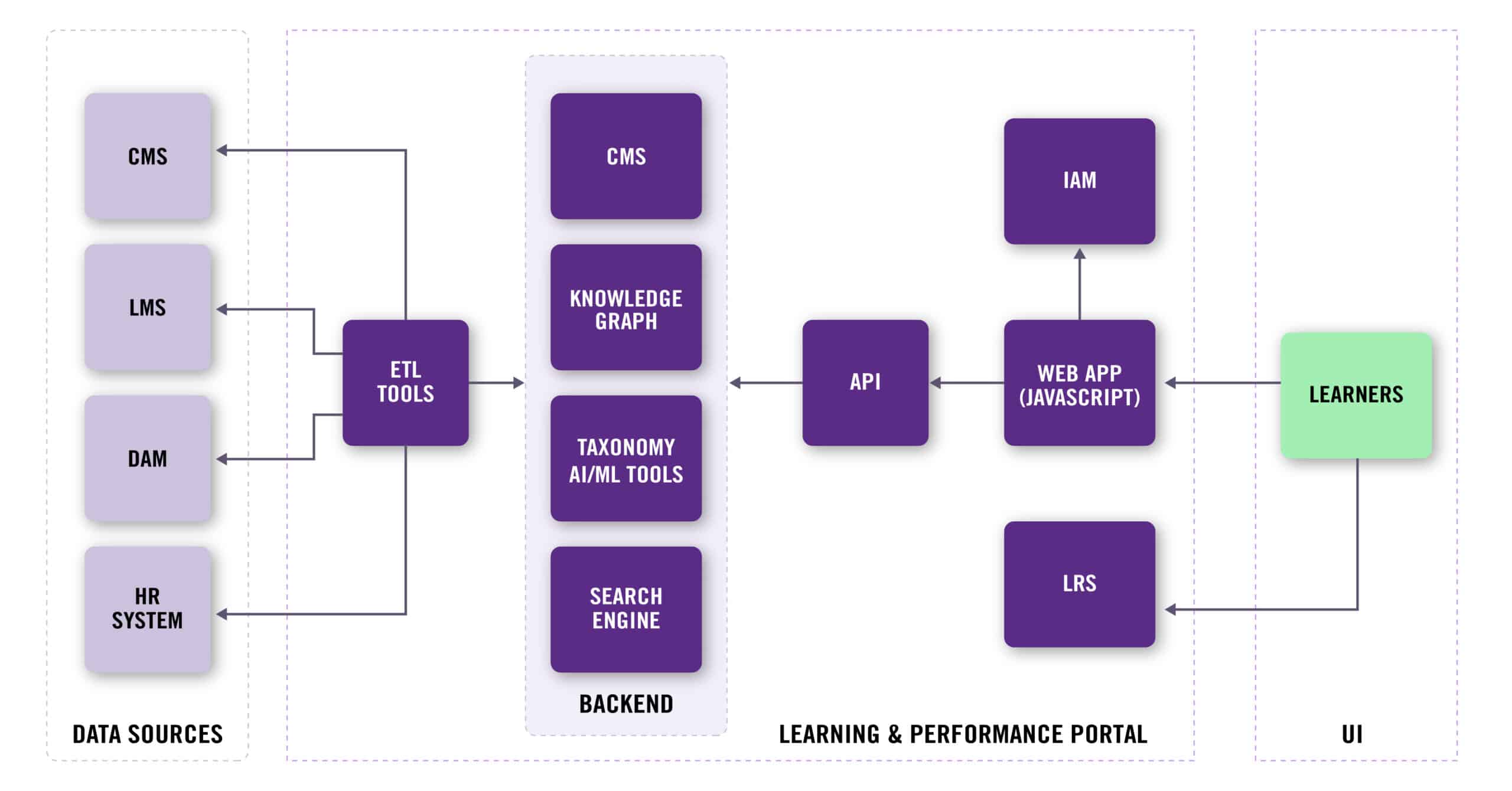 In a Knowledge Portal, typical data points collected include the number of unique visitors to the portal, which pages they’re spending time on, which pages have high bounce rates, and what terms users are frequently searching for. This data helps us understand the performance of the content and the portal itself. But in a Learning and Performance Portal, we need to understand the specific learning content users were exposed to and, ideally, data that indicates mastery of concepts and/or successful performance of tasks.
